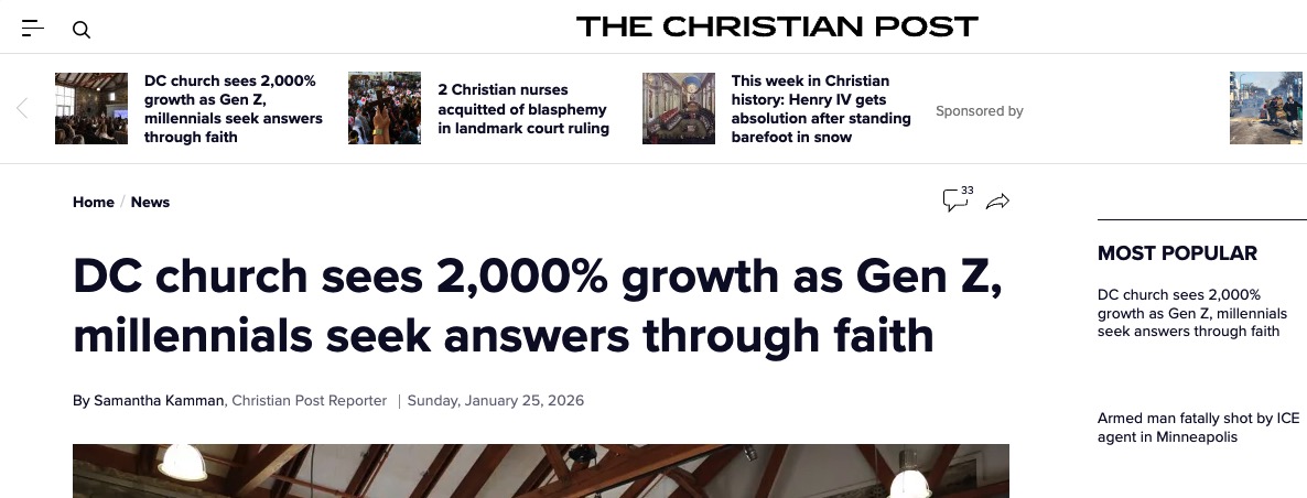 (Worthy Insights) – A Southern Baptist church in Washington, D.C., says it has seen a 2,000% growth in attendance over the last seven years, a trend that the congregation’s leaders attribute mostly to Generation Z and millennials gradually returning to religious life after the COVID-19 lockdowns and, more recently, the shocking assassination of Charlie Kirk.