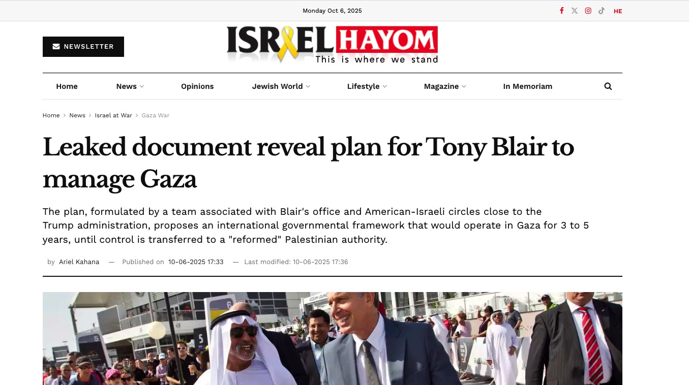 The plan, formulated by a team associated with Blair’s office and American-Israeli circles close to the Trump administration, proposes an international governmental framework that would operate in Gaza for 3 to 5 years, until control is transferred to a “reformed” Palestinian authority.