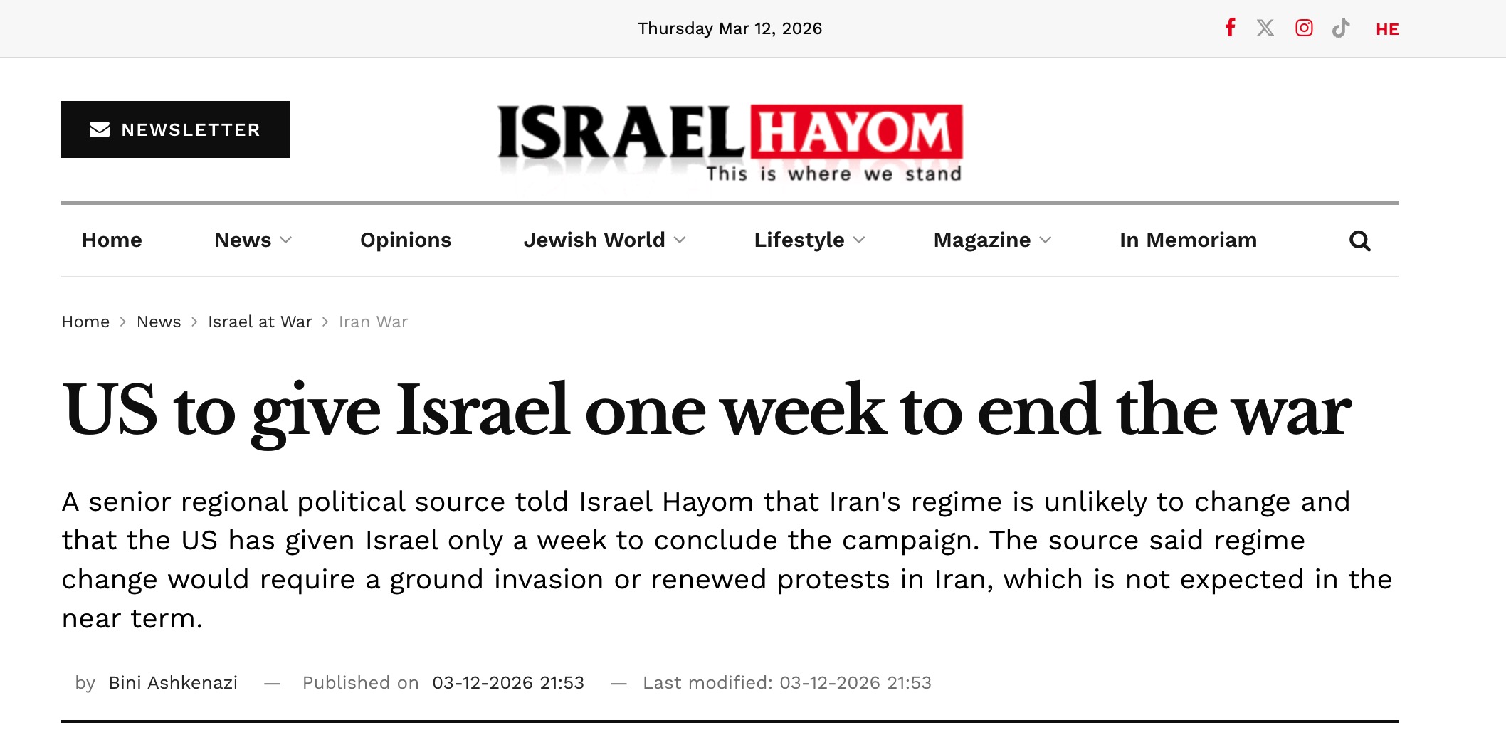 (Worthy Insights) – A senior political source from the Middle East tells Israel Hayom that the US wants the military campaign against Iran to end, and has given Israel just one week to conclude it. The source also assessed that the regime in Tehran is unlikely to be replaced, because such a change would require either a ground invasion by troops or the renewal of large-scale protests inside Iran, something the source does not believe will happen in the near future.